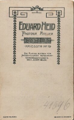 Das Ganzkörperportrait eines jungen Mannes im Carte de Visite - Format. Der Mann trägt einen zugeknöpften dunklen Anzug mit Einstecktuch, einem weißen gestärkten Stehkragen und dunkler Krawatte. Passend zu der formellen Kleidung sind seine dunklen Anzugschuhe poliert. Sein kurzes helles Haar ist sorgfältig in Wellen frisiert. Die Haltung des jungen Mannes ist aufrecht. Sein ernster Blick geht schräg am Betrachter vorbei, während sein Unterarm auf einem weißen Beistelltischchen ruht, auf dessen unterer Ablage eine Glasvase mit zwei Blumen plaziert ist. Seine andere Hand umfasst ein Paar Lederhandschuhe. Die bemalte Wand im Hintergrund bildet eine lichte Waldszenerie ab. Der Name des Fotografen, sowie die Stadt des Ateliers sind in der unteren rechten Ecke unter der Fotografie golden auf den Karton geprägt. Eingefasst wird die Schrift von einer ebenfalls goldenen Vignette. Die Informationen auf der Kartonrückseite werden ebenfalls von einem grafischen Jugendstilmuster im eingerahmt.