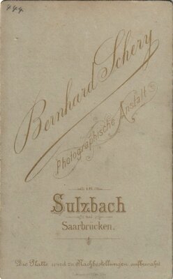 Ein Dreiviertelporträt eines jungen Mannes, der schräg am Betrachter vorbei sieht. Der Mann trägt ein dunkles Jacket mit Einstecktuch. Darunter ist ein weißer Kragen mit weißer Krawatte zu erkennen. Anhand der Nadel am Krawattenknoten könnte es sich hierbei um eine sogenannte Clip-Krawatte handeln. Eine solche Krawatte war lose bereits vorgebunden und musste nur noch durch eine Klammer, einen sogenannten Krawattenschieber, eine Nadel oder eine Öse am Hemdkragen befestigt werden, was den Bekleidungsprozess des Trägers wesentlich erleichterte und verschnellerte. Das Haar des Mannes ist kurz geschnitten und in Wellen zu einem Seitenscheitel frisiert. Sein Porträt ist von einer hellen Vignette eingefasst, in die es durch eine farbliche Überblendung übergeht. Unter der Fotografie sowie auf der Kartonrückseite sind Name und Adresse des Ateliers, sowie Informationen zur Nachbestellung und Vergrößerung von Fotografien aufgeführt.