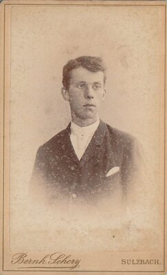 Ein Dreiviertelporträt eines jungen Mannes, der schräg am Betrachter vorbei sieht. Der Mann trägt ein dunkles Jacket mit Einstecktuch. Darunter ist ein weißer Kragen mit weißer Krawatte zu erkennen. Anhand der Nadel am Krawattenknoten könnte es sich hierbei um eine sogenannte Clip-Krawatte handeln. Eine solche Krawatte war lose bereits vorgebunden und musste nur noch durch eine Klammer, einen sogenannten Krawattenschieber, eine Nadel oder eine Öse am Hemdkragen befestigt werden, was den Bekleidungsprozess des Trägers wesentlich erleichterte und verschnellerte. Das Haar des Mannes ist kurz geschnitten und in Wellen zu einem Seitenscheitel frisiert. Sein Porträt ist von einer hellen Vignette eingefasst, in die es durch eine farbliche Überblendung übergeht. Unter der Fotografie sowie auf der Kartonrückseite sind Name und Adresse des Ateliers, sowie Informationen zur Nachbestellung und Vergrößerung von Fotografien aufgeführt.