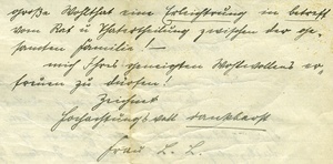 Handschriftlich verfasster Brief der Frau eines Patienten an die Lazarett-Verwaltung. Im Historischen Museum der Pfalz war vom 29.4.2014 bis 24.9.2027 die Ausstellung "1914 - 1918. Die Pfalz im Ersten Weltkrieg" zu sehen. Auf einen öffentlichen Aufruf hin meldeten sich zahlreiche Privatpersonen, ihre Objekte wurden in dieser Sammlung erfasst und z. T. auch in der Ausstellung gezeigt. Die Objekte befinden sich im Eigentum der Privatpersonen und sind nicht Teil der Sammlungen des Historischen Museums der Pfalz.