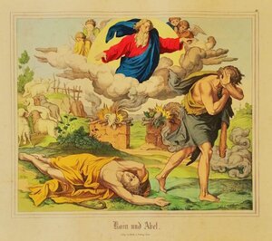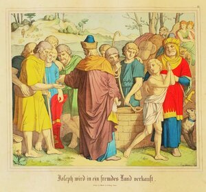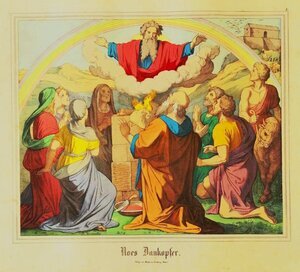 Bilder Bibel von J. Heinemann. Teil I : Bilder des Alten Testaments Die Edition enthielt ursprünglich 12 herausnehmbare colorierte Litograhien mit den Darstellungen der wichtigsten Ereignissen der Biblischen Geschichte, davon 12 Bilder des Alten Testaments. Weiterhin ein Vorwort und (nacherzählte) Beschreibungen der einzelnen Bilder. Von den ursprünglich 12 Bildern ist 1 abgängig und 11 erhalten. Die einzelnen Darstellungen: 1: Erschaffung der Welt ABGÄNGIG -auch nicht bei altestiche.com 2: Strafe der ersten Sünde ubd Verheißung des Erlösers 3: Kain und Abel 4: Die Sündflut 5: Noes Dankopfer 6: Josef wird in ein fremdes Land verkauft 7: Josefs Erhöhung 8: Josef giebt sich zu erkennen 9: Jakobs Reise nach Ägypten 10: Moses Geburt 11: Der brennende Dornbusch 12: Gott gibt die zehn Gebote auf Sinai