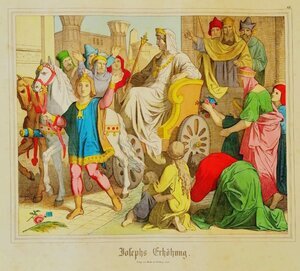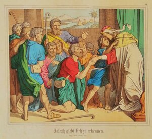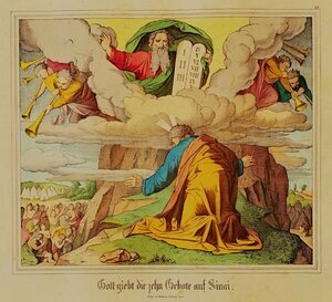 Bilder Bibel von J. Heinemann. Teil I : Bilder des Alten Testaments Die Edition enthielt ursprünglich 12 herausnehmbare colorierte Litograhien mit den Darstellungen der wichtigsten Ereignissen der Biblischen Geschichte, davon 12 Bilder des Alten Testaments. Weiterhin ein Vorwort und (nacherzählte) Beschreibungen der einzelnen Bilder. Von den ursprünglich 12 Bildern ist 1 abgängig und 11 erhalten. Die einzelnen Darstellungen: 1: Erschaffung der Welt ABGÄNGIG -auch nicht bei altestiche.com 2: Strafe der ersten Sünde ubd Verheißung des Erlösers 3: Kain und Abel 4: Die Sündflut 5: Noes Dankopfer 6: Josef wird in ein fremdes Land verkauft 7: Josefs Erhöhung 8: Josef giebt sich zu erkennen 9: Jakobs Reise nach Ägypten 10: Moses Geburt 11: Der brennende Dornbusch 12: Gott gibt die zehn Gebote auf Sinai