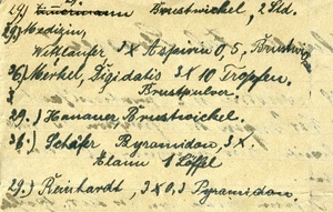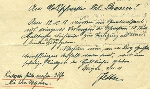 Handschriftliche Anweisung an Vollschwester Strasser betr. "Halstücher", vom 19.10.1918. Im Historischen Museum der Pfalz war vom 29.4.2014 bis 24.9.2027 die Ausstellung "1914 - 1918. Die Pfalz im Ersten Weltkrieg" zu sehen. Auf einen öffentlichen Aufruf hin meldeten sich zahlreiche Privatpersonen, ihre Objekte wurden in dieser Sammlung erfasst und z. T. auch in der Ausstellung gezeigt. Die Objekte befinden sich im Eigentum der Privatpersonen und sind nicht Teil der Sammlungen des Historischen Museums der Pfalz.