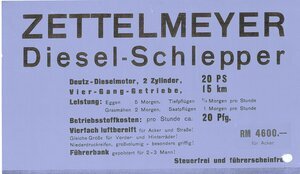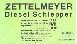 Unter dem Namen "Zeit und Kraft" verschickte 1936 die Hubert Zettelmeyer AG, Konz, zwei unterschiedliche Werbeprospekte für ihre Dieselschlepper an Interessenten. In dem blauen Prospekt wird der kleinere Diesel Schlepper (15 km/h) für den Landwirt beworben. Der 2 Zylinder Deutz Viertakt-Motor mit 20 PS Leitung, mit 4 Vorwärts- und 1 Rückwärtsgang, mit auswechselbaren Zylinderbuchsen. Der Preis ab Werk 4.600 RM. Im grünen Prospekt wir der etwas größere, schwerere und schnellere Straßenschlepper (20 km/h) beworben. Angetrieben wird er vom gleichen Motor wie der kleinere Bruder, jedoch mit einer anderen Getriebeübersetzung. Der Preis ab Werk lag bei 4.900 RM An Sonderzubehör stand für beide Ausführungen eine Seilwinde 450 RM, ein kompl. Mähbalken mit Antrieb 500 RM, ein Reserverad für 150 RM oder ein geschlossenes Führerhaus mit Tür, Schiebefenster und Winker (Richtungsanzeiger) für 350 RM zur Verfügung. Die Prospekte wurden 1936 in einer 3. Auflage von 10.000 Stück gedruckt.