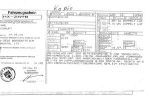 Der KFZ Brief gehörte zu einem im August 1957 in der DDR zugelassenem Diesel Schlepper Zettelmeyer Z 2. Der Eigentümer war Heinz Reuße, Landwirt aus Treugeböhla. Am 9. Dez wurde der Traktor auf die LPG Treugeböhla umgeschrieben, als Eigentümer blieb Heiz Reuße eingetragen. Nach einem weiteren Eigentumswechsel innerhalb der DDR wurde der Schlepper nach Westdeutschland verkauft. Neuer Eigentümer wurde am 2.6.1993 Karl Kohaupt aus Borgentreich. Eine Kopie der Westzulassung mit dem Kennzeichen HX ZA 98 ist in den Brief einkopiert. Auf den Seiten 6 & 7 sind sämtliche technisch notwendigen Angaben eingetragen.