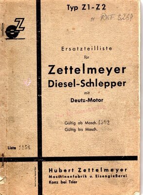 Ersatzteillister für Zettelmeyer Dieselschlepper Z 1 und Z2