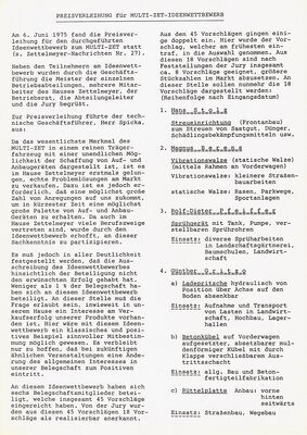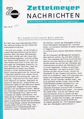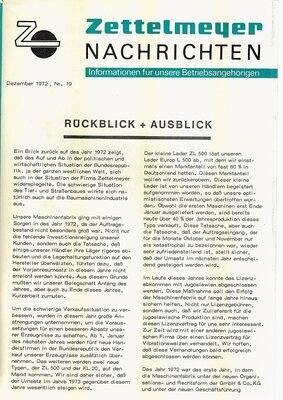 In den 1970er Jahren lief die, seit 1951 quartalsweise erscheinende Werkszeitung „Dampfwalze“ aus. Die sehr hochwertige Informationszeitschrift wurde durch die einfachere, deutlich kürzere „Zettelmeyer Nachrichten“ ersetzt. Das erste Exemplar erschien im Oktober 1971. In unserem Bestand befinden sich 22 Ausgaben, durchgängig von der Nr. 8 aus 1972 bis zum Heft Nr. 29 aus dem Juni 1975. Danach übernahm die IHB (Intern. Baumasch. Holding) das Unternehmen. Die Informationszeitschrift für Betriebsangehörige beschränkt sich meist auf 6 – 8 Seiten, auf denen in komprimierter Form Betriebswirtschaftliches, Personelles, Betriebsinternas, Familiäres der Mitarbeiter und allgemeine Themen vorgestellt werden. Die Letzte Ausgabe von Juni 1975 berichtet ausführlich über das Ergebnis der Betriebsratswahl und über die Preisverleihung eines Ideenwettbewerbs zu Gunsten einer Neuentwicklung, dem Trägerfahrzeug MULTI-ZET. Daraus zitiert: …es muß jedoch in aller Deutlichkeit festgestellt werden, daß die Ausschreibung des Ideenwettbewerbs hinsichtlich der Beteiligung nicht den gewünschten Erfolg gehabt hat. Weniger als 1% der Belegschaft hat sich beteiligt. An dieser Stelle muß die Frage erlaubt sein, inwieweit in unserem Hause ein Interesse am Vekaufserfolg unserer Produkte vorhanden ist….