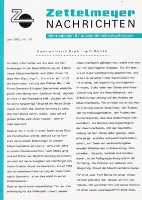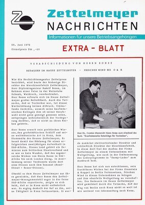 In den 1970er Jahren lief die, seit 1951 quartalsweise erscheinende Werkszeitung „Dampfwalze“ aus. Die sehr hochwertige Informationszeitschrift wurde durch die einfachere, deutlich kürzere „Zettelmeyer Nachrichten“ ersetzt. Das erste Exemplar erschien im Oktober 1971. In unserem Bestand befinden sich 22 Ausgaben, durchgängig von der Nr. 8 aus 1972 bis zum Heft Nr. 29 aus dem Juni 1975. Danach übernahm die IHB (Intern. Baumasch. Holding) das Unternehmen. Die Informationszeitschrift für Betriebsangehörige beschränkt sich meist auf 6 – 8 Seiten, auf denen in komprimierter Form Betriebswirtschaftliches, Personelles, Betriebsinternas, Familiäres der Mitarbeiter und allgemeine Themen vorgestellt werden. Die Letzte Ausgabe von Juni 1975 berichtet ausführlich über das Ergebnis der Betriebsratswahl und über die Preisverleihung eines Ideenwettbewerbs zu Gunsten einer Neuentwicklung, dem Trägerfahrzeug MULTI-ZET. Daraus zitiert: …es muß jedoch in aller Deutlichkeit festgestellt werden, daß die Ausschreibung des Ideenwettbewerbs hinsichtlich der Beteiligung nicht den gewünschten Erfolg gehabt hat. Weniger als 1% der Belegschaft hat sich beteiligt. An dieser Stelle muß die Frage erlaubt sein, inwieweit in unserem Hause ein Interesse am Vekaufserfolg unserer Produkte vorhanden ist….