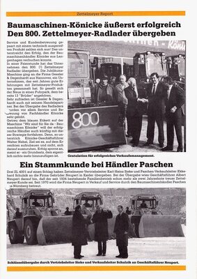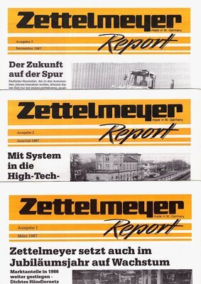 1987, Zettelmeyer hatte inzwischen den 4. Besitzer, die Eder-Maschinenfabrik aus Mainburg/Donau, wurde erneut ein Firmeninternes Informationsblatt „Zettelmeyer Report“ aufgelegt. Die ersten 3 Ausgaben, die unter dem neuen Besitzer aufgelegt wurden, sind erhalten geblieben. Als Herausgeber wird weiterhin Zettelmeyer, Konz genannt. Die Hefte bestehen meist aus 4-5 Seiten DIN A 4 Seiten mit entsprechendem Bildmaterial. Alle Ausgaben berichten von Investitionen in die Produktion, von der Teilnahme an Internationalen Messen, der Weiter- bzw Neuentwicklungen von Radladern, bis hin zu einem Anzeigenbereich. In der Rubrik Baumaschinen Markt, konnten Zettelmeyer Kunden ihre „Gebrauchten“ zum Verkauf anbieten.