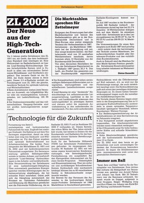 1987, Zettelmeyer hatte inzwischen den 4. Besitzer, die Eder-Maschinenfabrik aus Mainburg/Donau, wurde erneut ein Firmeninternes Informationsblatt „Zettelmeyer Report“ aufgelegt. Die ersten 3 Ausgaben, die unter dem neuen Besitzer aufgelegt wurden, sind erhalten geblieben. Als Herausgeber wird weiterhin Zettelmeyer, Konz genannt. Die Hefte bestehen meist aus 4-5 Seiten DIN A 4 Seiten mit entsprechendem Bildmaterial. Alle Ausgaben berichten von Investitionen in die Produktion, von der Teilnahme an Internationalen Messen, der Weiter- bzw Neuentwicklungen von Radladern, bis hin zu einem Anzeigenbereich. In der Rubrik Baumaschinen Markt, konnten Zettelmeyer Kunden ihre „Gebrauchten“ zum Verkauf anbieten.