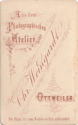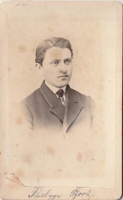 Ein Porträt im Visiteformat. Es zeigt einen jungen Mann im Dreiviertelprofil, der in einem handschriftlichen Vermerk unterhalb der Fotografie als Philipp Pfortz benannt wird. Sein Jackett scheint zugeknöpft, darunter ist ein weißer Hemdkragen mit gebundener gemusterter Krawatte, sowie der Ansatz einer Anzugweste zu erkennen. Das kurze Haar ist leicht nach hinten gekämmt und zu einem Seitenscheitel frisiert. Eine für Carte de Visite Porträts typische helle Vignettierung ist auf dieser Fotografie nur im Schulterbereich und unterhalb der Brust des Mannes auszumachen. Der unten vermerkte Familienname Pfortz wird wohl vom lateinischen Wort "Portus" für Hafen, hergeleitet und lässt sich auf die bis 1939 gleichnamige Gemeinde im Kreis Germersheim in Rheinland-Pfalz zurückverfolgen, die heute unter dem Namen Maximiliansau einen Ortsbezirk der Stadt Wörth bildet. Ungewöhnlicherweise sind auf der unteren Kartonvorderseite keine Hinweise auf das Fotoatelier oder den Entstehungsort der Fotografie zu finden. Erst auf der Kartonrückseite findet sich ein mit Jugendstilgrafiken verzierter Aufdruck in roter Farbe mit dem Namen des Ateliers, sowie dessen Standort und einem Hinweis zur Nachbestellung.
