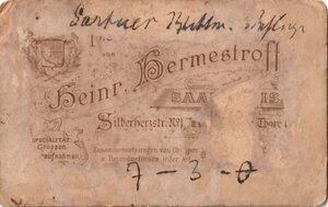 Auf diesem Porträt schaut der abgebildete Mann für das Visitformat typisch mit ernstem Blick am Betrachter vorbei. Sein kurzes Haar scheint, soweit noch erkennbar, sorgfältig zu einem Seitenscheitel frisiert zu sein. Unter dem aufgeknöpften Jackett mit doppelter Knopfleiste sind eine Weste und ein weißer gestärkter Kragen mit Fliege zu erahnen. Unterhalb der Fotografie, sowie auf der Kartonrückseite sind Name und Adresse des Fotoateliers abzulesen, wobei die Rückseite mit Jugendstilgrafiken und einem Wappen verziert ist. Im Stil der Carte de Visite ist die Fotografie von einer hellen ovalen Vignette umgeben, welche sich deutlich vom eigentlichen Portrait abgegrenzt und keinerlei Verzierungen aufweist. Vignetten wie diese wurden zum Ende des 19. Jahrhunderts häufig verwendet, oft findet man auf Carte de Visite auch Vignetten mit einem weichen Verlauf. Die Verzierung von Fotografien mit solchen Vignetten blieb bis in die Anfänge des 20. Jahrhunderts bestehen, wobei Vignetten mit sich wandelndem technischen Fortschritt jedoch nie ganz verschwanden, sondern nur um einiges subtiler wurden. Bis heute werden sie in der Fotografie als Stilmittel genutzt, um den Blick den Betrachters auf die gewünschten Stellen im Bild zu lenken, nur sind sie meistens nicht mehr hell, sondern dunkeln die Seitenpartien von Fotografien eher ab.