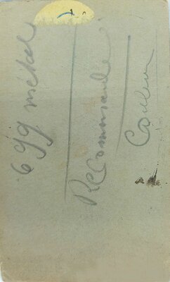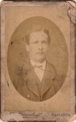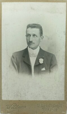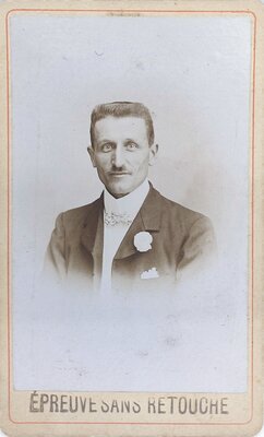 Dies ist ein seltener Fall, in dem unterschiedliche fotografische Ausführungen von Carte de Visite mit und ohne Retusche vorliegen. Auf der ersten der drei Fotografien ist der schnauzbärtige Mann im Dreiviertelprofil porträtiert. Er trägt einen dunklen Frack oder ein Jackett mit einer am Kragen befestigten weißen Rose und weißem Einstecktuch. Darunter ist ein weißes Hemd mit gestärktem hohen Kragen und einer gemusterten Fliege zu erahnen. Gerahmt wird das Porträt durch eine helle Vignette mit weichem Verlauf. Die Vignette, sowie die Kleidung des Mannes sind auf allen drei Ausführungen identisch und den Bildunterschriften nach im selben Fotoatelier, wohl auch am selben Tag gefertigt. So ändert sich auf der zweiten Fotografie lediglich die Pose des Mannes, der hier direkt in die Kamera blickt. Damit verglichen könnte die dritte Fotografie, welche den Mann in eben genau dieser in die Kamera blickenden Pose zeigt, wohl für Überraschung beim Betrachter sorgen. Hier liegt ein Beweis vor, dass auch lange vor der digitalen Fotografie Bildretuschen stattfanden. Die nicht retuschierte Version der Fotografie, welche Kunden eher selten zu Gesicht bekamen, zeigt den porträtierten Mann mittleren Alters mit deutlichen Nasolabialfalten und Krähenfüßen. Unter dieser Version ist in französischer Sprache vermerkt, dass dies ein unretuschierter Abzug sei. Die Kartonrückseiten sind (für Carte de Visite ungewöhnlicherweise) nicht bedruckt. Nur auf der Rückseite der retuschierten Version mit Blick in die Kamera ist auf französisch handschriftlich vermerkt, dass eine Colorierung empfohlen wird.
