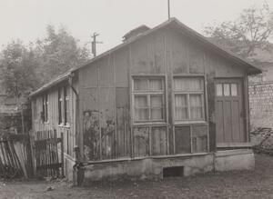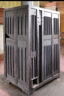 Ofen aus Eisenblech in der RAD Baracke. Der Ofen aus vernietetem Eisenblech stammt sehr wahrscheinlich genau aus dieser Baracke. Er hat keine Reguliermöglichhkeit und ist mit minimalem Materialverbrauch (Eisen) erbaut. Der Ofen entspricht nicht dem späteren Standardtyp. Das "Innenleben des Ofens (Roste, Ascheschublade) ist abgängig.