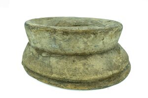 Eine Hutform für flache Kopfbedeckungen, vermutlich Schirmmützen oder Hüte im Matrosenstil. Die Form besteht aus einem weichen, organischen Gewebe, bei dem es sich eventuell um Jute handelt. Dieses Gewebe ist mit einem harten Obermaterial, vermutlich einem pflanzlichen Harz, überzogen. Die Innenseite der Form ist rund gewölbt und mit einem gelochten Holzbalken stabilisiert. An solch einem Balken konnte man die Hutform bei der Arbeit entweder bequem in der Hand halten oder auf einen Hutständer stecken. In der Oberfläche der gewölbten Innenseite sind viele kleine Einstichlöcher zu erkennen, welche sehr wahrscheinlich durch Stecknadeln verursacht wurden. Diese nahmen Hutmacher zur Hand, um noch nicht befestigtes Material vorläufig zu drapieren. Auch Dekorationen konnten so vorab angeordnet werden.