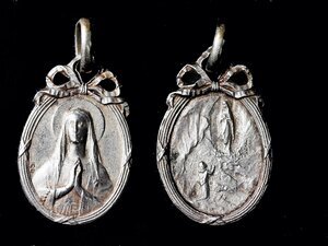 Ovale Medaille als Andenken von einer Wallfahrt nach Lourdes (Pyrenäen, Frankreich) oder - wahrscheinlich - von einem Besuch einer Lourdesgrotte. Die Wallfahrt geht auf 1858 erfolgten Marienerscheinungen von Bernadette Soubirous zurück. Besonders gegen Ende des 19. Jahrhunderts und Anfang des 20. Jahrhunderts entstanden weltweit über 1000 so genannte Lourdesgrotten als verkleinerter Nachbau der Grotte in Lourdes. Teils innerhalb von römisch-katholischen Kirchen, teils im Freien auf Kirchhöfen oder als Flurdenkmal an einer Wegkreuzung, am Feldrand oder im Wald errichtet. An der Stelle der Marienerscheinungen ziert eine Madonnenfigur die Grotte, deren Original Joseph-Hugues Fabisch 1864 nach den Angaben Bernadettes für Massabielle schuf. Manche Grotten befinden sich in Kirchen und Kapellen mit dem Patrozinium Unserer Frau von Lourdes oder gehören zu einem ihr geweihten Seitenaltar in einer Kirche. Die Medaille: Die Abbildung auf der Vorderseite der Medaille zeigt Bernadette Soubirous betend mit nach oben gerichteten Händen vor der Grotte in der ihr die Muttergottes erschienen ist. Die Rückseite zeigt ein Brustbild der Lourdesmadonna mit Heiligenschein. Die Öse zum Aufhängen der Medaille ist mit dieser mittels einer kunstvollen Schleife aus Metall verbunden.