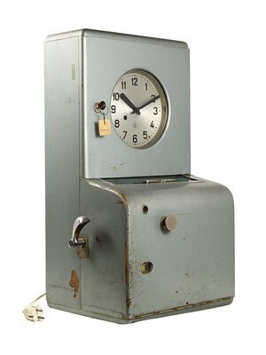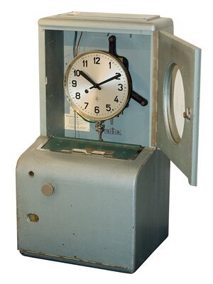 Eine Stempeluhr, auch Kontrolluhr oder Stechuhr, ist ein Arbeitszeitmesser, der den Arbeitsbeginn und das Arbeitsende von Arbeitnehmern aufzeichnet. Diese von einem elektrischen Laufwerk angetriebene Stempeluhr wurde ca.1940 von der Firma Telefonbau Normalzeit hergestellt und fand ihren Einsatz in Mainz bei der Fa. "Hemden Herberg" bis Ende der 90iger Jahre. Die Uhr verrät ihre Herstellung im 2. WK durch ihr Holzgehäuse, welches mit einem Hammerschlaglack überzogen wurde, um ein Metallgehäuse als Schrumpf-Alu-Spritzguss vorzutäuschen. Ihre lange Laufzeit verdankt die Uhr der regelmäßigen Wartung und Pflege des Eigentümers der Fa. Hemden Herberg Herrn Heribert Stehle.