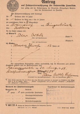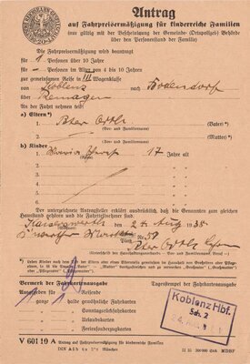 Vordruck der Deutschen Reichsbahn-Gesellschaft auf dem kinderreiche Familien eine Fahrpreisermäßigung für Zugfahren beantragen konnten. Der Vordruck wurde mit der Hand ausgefüllt und eingetragen für wieviel Kinder die Ermäßigung gelten soll, Wagenklasse, Fahrstrecke, Wer die Eltern sind und der Name des Kindes. Unterschrieben wurde der Antrag vom Erziehungsberechtigten. Vor dem Fahrkartenkauf musste der Antrag eingereicht werden und wurde am jeweiligen Startbahnhof abgestempelt. Die drei Anträge sind für die Fahrstrecken Düsseldorf nach Bodendorf über Köln und Remagen am 13.08.1938, von Bodendorf nach Bingerbrück über Koblenz am 24.08.1938 und Koblenz nach Bodendorf über Remagen am 24.08.1938 ausgestellt. Der Antragsteller war Peter Orth aus Düsseldorf.