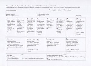 Die Ahnentafel ist ein Diagramm mit der Darstellung der Vorfahren (der Ahnen) des Lehrers Peter Orth aus Düsseldorf, in der die Verwandtschaftsverhältnisse geordnet verzeichnet waren. Neben der Originalahnentafel sind auf drei Einzelblätter weitere handschriftliche Eintragungen, allerdings undatiert, beigefügt. Sie enthält beide Elternteile und deren namentlich bekannte Voreltern von diesen stammt Peter Orth in gerader Linie ab. Während des Nationalsozialismus wurden, im Sinne des rassistischen und antisemitischen Ausleseprinzips der Diktatur, Ahnentafeln für den sogenannten Ariernachweis eingefordert. Der Ariernachweis war im nationalsozialistischen Deutschland von 1933 bis 1945 für bestimmte Personengruppen (insbesondere Mitglieder der SS, Beamte, öffentlicher Dienst, Ärzte, Juristen, Wissenschaftler deutscher Hochschulen, umgesiedelte und neu eingebürgerte Volksdeutsche) ein von Staats- und Regierungsbehörden geforderter Nachweis (beglaubigte Ahnentafel) einer „rein arischen Abstammung“ aus der „arischen Volksgemeinschaft“. Mit dem Ariernachweis begann die Ausgrenzung von „Nichtariern“, vor allem Juden, „Zigeunern“, die über die Aberkennung ihrer Bürgerrechte und Ausgrenzung bis zur Vertreibung, Ghettoisierung, Deportation und staatlich organisierten Massenermordung in Konzentrationslagern (Holocaust und Porajmos) (1941-1945) führte. Dagegen galt „ein Engländer oder Schwede, ein Franzose oder Tscheche, ein Pole oder Italiener ... als verwandt, also als arisch“. Ariernachweise verlangten auch Berufsverbände, die Reichskulturkammer für alle künstlerisch Tätigen, ferner viele Unternehmen und ein Teil der Kirchen als Zugangsvoraussetzung für eine Anstellung sowie die NSDAP für die Aufnahme als Parteimitglied.