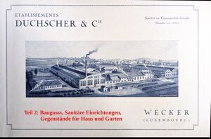 Gusswaren und Maschinenteile von Duchscher & Cie, Wecker Luxembourg. Produktkatalog in Form einer Loseblattsammlung, Gruppe II: Baugusss, Sanitäre Einrichtungen, Gegenstände für Haus und Garten Zu jedem Produkt gibt es eine Abbildung in Form einer technischen Zeichnung, einen Text in deutscher und/oder französischer Sprache, und z. T. auch Tabellen mit hauptsächlich numerischen Werten.