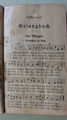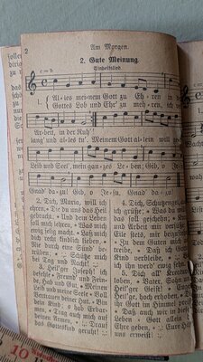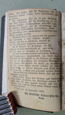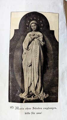 Das überaus dicke Buch enthält (alle?) im Bistum Trier (damals) für Messen und Andachten gebräuchlichen Gebete und Gesänge sowie eine Abbildung der Maria Immaculata. Einband aus Pappe. 292 (Gesänge) + 361 (Gebete) Seiten Vorworte von Bischof Michael Felix (Korum) und Generalvikar Reuß