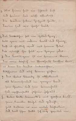 14zeiliges Gedicht, teilweise in Mundart geschrieben, zur Hochzeit von Peter Orth. Das Gedicht ist in Sütterlin mit feiner Feder geschrieben.