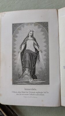Das Büchlein enthält ein Bild der Maria als Immaculata, eine Titelseite mit einer Abbildung der Maria vom Monte Carmelo (eine Ikone, heute im Dom von Neapel), Gebete zu Tageszeiten und für Andachten, Litanerien und Lieder auf 125 Seiten. Auf der 1. Seite innen steht der Name des Besitzers: N.Scheil geb. 6/12 (18)68 SDaarburg (Trier) (ein unlesbarerer Strasßenname) 2