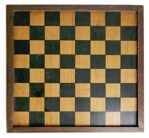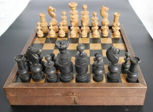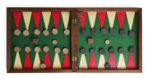 Spieleset mit Backgammon, Schach, Dame, Mühle. Das Set besteht aus den 32 Schachfiguren in einem Holzkästchen sowie einem aufklappbaren zweilagigem Spielbrett. Auf den Außenseiten befinden sich die Markierungen für Dame und Schach auf der einen Seite und Mühle auf der anderen Seite. Klappt man auf, so befindet sich im Inneren das Spielbrett für Backgammon und lose darin die Spielsteine für Dame, Mühle und Backgammon. Die Verpackung ist leider nicht erhalten. Leider kein Hinweis auf den Hersteller. Die Form der Schachfiguren könnte auf einen französischen Hersteller hindeuten.