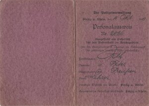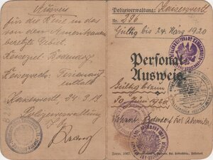 Personalausweis Nr. 296 der am 24. März 1919 von der Polizeiverwaltung/Bürgermeister Kaiserswerth für den Lehrer Peter Orth ausgestellt ist auf weißem Karton mit runden Ecken vorgedruckt und die persönlichen Daten (biometischen Daten) sind von Hand eingetragen worden. Zunächst war der Personalausweis mit einer Gültigkeit bis 24. März 1920 ausgestellt und dann verlängert bis zum 30. Juni 1920. Auf dem Personalausweis befindet sich die Sichtvermerke der Polizeibehörde Kaiserswerth, der französichen Mititärverwaltung und vor der Polizeiverwaltung Remagen. Bodendorf gehörte nach dem 1. Weltkrieg zur Stadtverwaltung Remagen.