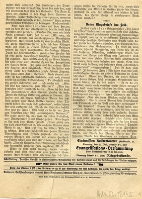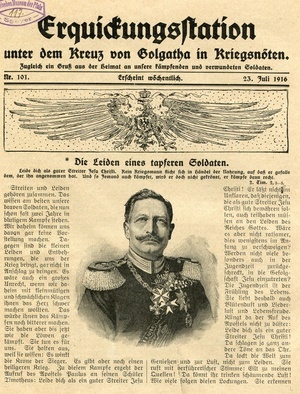 Missionsblatt "Erquickungsstation unter dem Kreuz von Golgatha in Kriegsnöten. Zugleich ein Gruß aus der Heimat an unsere kämpfenden und verwundeten Soldaten." 4-blättriges Missionsblatt der Evangelischen Vereinsbuchhandlung Kaiserslautern; 23. Juli 1916.