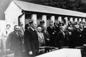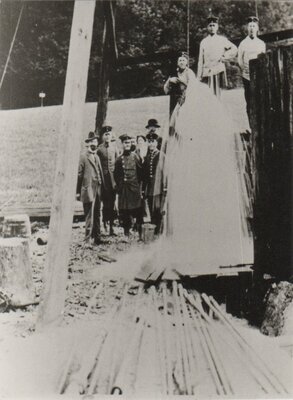 Gruppe von Arbeitern und einer Frau an der Fontaine der Ahrquell 1889