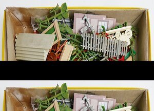 Pappschschatel mit Plastikspielzeugteilen zum Zusammenbau. Der Karton Faller B 268 enthält Modelle aus Kunststoff, typischerweise als Zubehör zur Modelleisenbahn. Das Spielzeug wirkt sehr abgespielt.