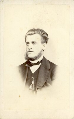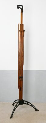 Kartenständer "Pestalozzi" mit zwei schwenkbaren Seitenarmen auf der Rückseite und einem drehbaren Arm vorne sowie einem Schiebegriff zum Höherstellen seitlich. Standfuß (Dreifuß) und Klemme aus Gusseisen, oben Greifklaue für die Aufnahme von Wandkarten mit Stäben.