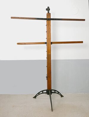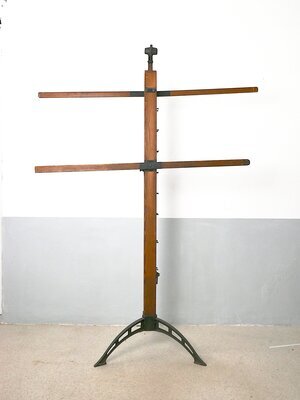 Kartenständer "Pestalozzi" mit zwei schwenkbaren Seitenarmen auf der Rückseite und einem drehbaren Arm vorne sowie einem Schiebegriff zum Höherstellen seitlich. Standfuß (Dreifuß) und Klemme aus Gusseisen, oben Greifklaue für die Aufnahme von Wandkarten mit Stäben.