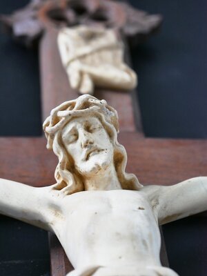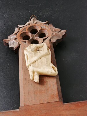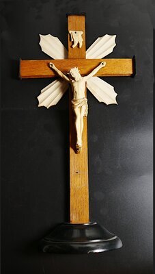 Mittelbraun gebeiztes Wandkreuz aus Eichenholz. Die Arme sind schräg nach oben ausgestreckt. Der Korpus hat mehrere Bruchstellen und ist wie der Titulus aus weißem Biskuit-Porzellan gefertigt. Die Füße stehen übereinander auf einer Konsole (3-Nagel Typ). Sie sind auf dieser und dmit dieser am vertikalen Balken befestigt. Über dem Korpus hängt der Titulus crucis (die INRI-Tafel). Die Schrift ist kaum mehr lesbar. Die Enden der Balken zieren kunstvoll gearbeitete und durchbrochene Vierpässe, die von Ornamenten umspielt werden.