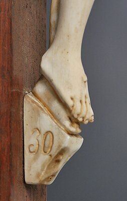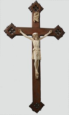 Mittelbraun gebeiztes Wandkreuz aus Eichenholz. Die Arme sind schräg nach oben ausgestreckt. Der Korpus hat mehrere Bruchstellen und ist wie der Titulus aus weißem Biskuit-Porzellan gefertigt. Die Füße stehen übereinander auf einer Konsole (3-Nagel Typ). Sie sind auf dieser und dmit dieser am vertikalen Balken befestigt. Über dem Korpus hängt der Titulus crucis (die INRI-Tafel). Die Schrift ist kaum mehr lesbar. Die Enden der Balken zieren kunstvoll gearbeitete und durchbrochene Vierpässe, die von Ornamenten umspielt werden.