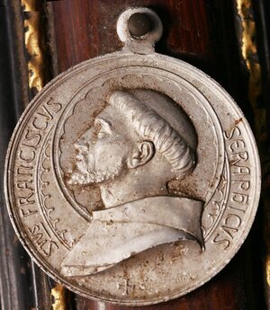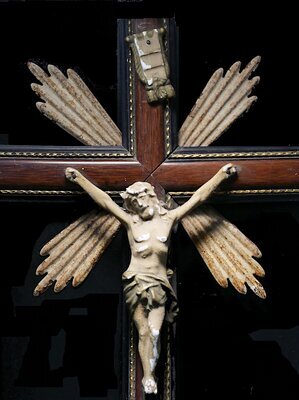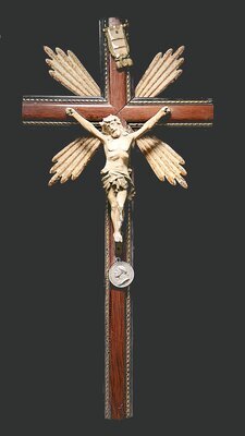 Mittelbraun gebeiztes Wandkreuz aus Eichenholz. Die Arme sind schräg - etwa im 45° Winkel - nach oben ausgestreckt. Der Korpus und der Titulus crucis (die INRI-Tafel) sind aus weißem Biskuit-Porzellan gefertigt. Der Corpus und seine ockergelbe Fassung ist an einigen Stellen beschädigt. Die Buchstaben auf dem Titulus crucis sind nicht mehr lesbar. Die Füße stehen übereinander auf einer Konsole (3-Nagel Typ). Sie sind auf dieser und mit dieser am vertikalen Balken befestigt. Aus dem Kreuzungspunkt zwischen Längs- und Querbalken ragen im 45°-Winkel 4 gelbe Strahlen. Die Ränder der Balken sind mit vergoldeten Ornamenten verziert. Unter dem Corpus hängt eine Medaille mit der Abbildung des Kopfs des Hl. Franziskus und der Umschrift STVS FRANCISCVS SERAPHICVS