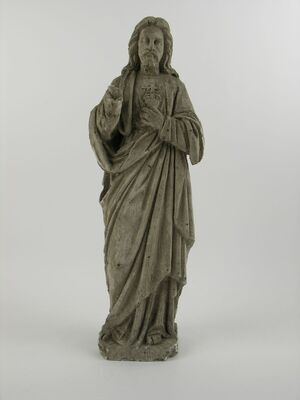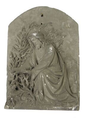Das Wandkreuz ist aus hellem, hellgrau glasiertem Ton Die Arme von Jesus sind waagrecht ausgestreckt. Jesus ist mit Heiligenschein, Dornenkrone und Bart dargestellt. 4-Nageltyp. Der rechte Querbalken samt Arm ist abgebrochen und wurde wenig fachmännisch geklebt. Das Kruzifix erinnert stilistisch ganz entfernt an romanische Darstellungen.