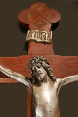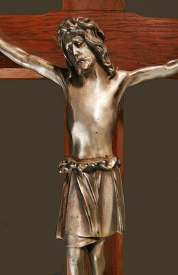 Hölzernes, dunkelbraun gebeiztes Wandkreuz. Die Enden des Kreuzes sind typisch neugotisch mit 3 Passen geschmückt. Der Korpus ist aus Neusilber. Die Arme sind schräg nach oben ausgestreckt. Die Füße stehen übereinander auf einer Konsole. Sie sind auf dieser angeklebt und letztere ist mit einem Nagel am vertikalen Balken befestigt. Über dem Korpus hängt der zweizeilige Titulus crucis (die INRI-Tafel) auf einem geschwungenen Band.