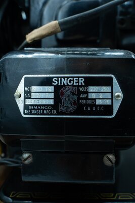 Bei diesem Objekt handelt es sich um eine elektrische Nähmaschine des Herstellers Singer. Die schwarze Maschine ist in einen hölzernen Sockel eingelassen, der sich auf der linken Seite durch eine Klappe zum Erhalt einer größeren Arbeitsfläche erweitern lässt. Die goldenen Akzente auf dem Maschinenkörper umfassen nicht nur die geometrischen Verzierungen auf der Nähfläche, an der motorisierten Kurbel und dem Einstellungshebel für die Stichweise. Auch der Markenname, das Logo in Form eines Siegels und die Klasse der Maschine (15 B) sind goldfarben hervorgehoben. Unterhalb des Logos und der Klassifizierung lässt sich auf der Sockeloberseite die Seriennummer SA 851980 ablesen. Die Buchstaben "SA" vor der Nummer weisen auf den Prodiktionsort der Maschine hin, hier Bonnières in Frankreich. Anhand der darauffolgenden Seriennummer, sowie auch der Klassifizierung kann die Maschine auf ihr ungefähres Baujahr datiert werden. An der Maschinenrückseite befindet sich der Motor für der Antrieb der Maschine. Auf ihm ist ein anderes Singer-Logo aufgebracht als auf der Vorderseite, sowie diverse Daten zum Motor. Der Motor ist durch einen bezifferten Motorgurt mit der manuell verstellbaren Kurbel verbunden. Unterhalb der Kurbel befindet sich ein Stromanschluss. Mit diesem sind sowohl der Motor, als auch die verstellbare Lampe an der Maschinenoberseite verbunden. Bei Entfernung der Metallabdeckung, welche unterhalb des Stromanschlusses im Holzsockel befestigt ist, wird eine Versenkung im Sockel mit noch erhaltenen Nähutensilien sichtbar, welche als kleines Nähkästchen dient.