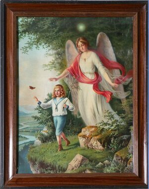 Die Farblithographie ( Chromolithografie) zeigt auf den ersten Blick eine Gebirgslandschaft, die sich erst bei genauem Hinsehen als Abgrundszene entpuppt. Ein Junge läuft einem Schmetterling hinterher, der Richtung Abgrund flattert. Hinter dem Knaben steht ein riesiger, im Vergleich zu dem Kinder überlebensgroßer weiblicher Engel. Er ist weiß gekleidet, besitzt einen ockerfarbenen, locker um die Brust gewickelten Schleier und beschützt mit ausgestreckten Armen den zum Abgrund gehenden Knaben. Bildkomposition sehr ähnlich aber z.T. andere Farben wie HR 4428. Bei der handelt es sich um eines der in verschiedenen Varianten und Größen meistverbreiteten Schutzengelbilder.. Auch wenn sich das Schutzengelmotiv seit der Renaissance in zahlreichen Bildwerken wiederfindet, so ist sein Zenit bei der Jahrhundertwende vom 19. zum 20. Jahrhundert. Untrennbar verbunden ist dieser mit der Entwicklung der Chromolithographie, durch die es möglich wurde hochwertige Farbdrucke für alle Bevölkerungsschichten erschwinglich herzustellen. Schutzengelbilder wurden vor allem in katholischen Gegenden hergestellt. Sie hatten jedoch auch ihren Platz bei evangelischen Familien. Sie warnten Kinder vor gefährlichen Situationen wie Abbrüchen und instabilen Brücken und spendeten Trost bei Krankheiten.