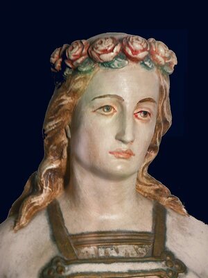 Gipsfigur der Heiligen Lucia von Syrakus. Sie trägt weiße Kleider mit goldenen Rändern und auf dem Kopf einen Kranz mit roten Rosen. Lucia wird mit zwei ihrer Attribute, auf dem Kopf einen Kranz aus Rosen und eine Schüssel mit ihren ausgerissenen Augen dargestellt. Der Legende nach Lucia habe ihrem ungeliebtem Verlobten ihre ausgerissenen Augen geschickt, worauf die Mutter Gottes ihr dafür noch schönere Augen zurückgegeben habe. Nach einer anderen Legende, die sich auf ihren Namen bezieht, soll Lucia nachts Lebensmittel in die Katakomben von Syrakus gebracht haben, wo sich Christen geheim trafen. Um den Weg im Innern zu beleuchten und gleichzeitig die Hände zum Tragen frei zu haben, setzte sie sich einen Kranz aus Kerzen auf den Kopf. Diese Tradition des Lichttragens wird bis heute am Luciafest besonders in Nordeuropa fortgeführt. Es kündigt vor der Wintersonnenwende das Licht an, das an Weihnachten in die Welt kommt.