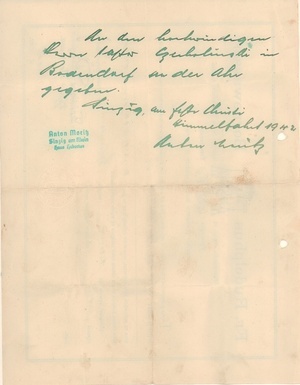Die Urkunde wurde von Bischof Bornewasser für eine Schwester Barbara ausgestellt und von Anton Moritz aus dem Haus Hubertus in Sinzig an den Bodendorfer Pastor Oskar Czecholinski am 29. Mai 1942 übergeben.