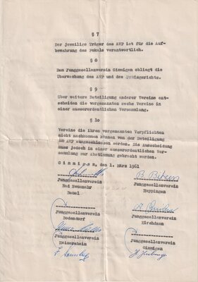 Bei der Satzung handelt es sich um eine Neufassung der Satzung vom 28.8.1948 ist ein Original mit den Unterschriften der damaligen Junggesellenpräsidenten. Die Satzung wurde mit den Junggesellenvereinen Bad Neuenahr, Beuel, Bad Bodendorf, Heimersheim, Heppingen, Kirchdaun und Gimmingen geschlossen. In zehn Paragraphen verpflichteten sich die Verein z. B. 1/6 der Kosten für die Beschaffung des Pokals zu übernehmen und das Prozedere des Wettkampfes um den Ahrtalwanderpokal zu befolgen.