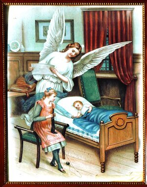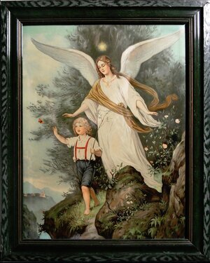 Die Farblitographie ( Chromolithografie) zeigt auf den ersten Blick eine arkadische Landschaft, die sich erst bei genauem Hinsehen als Abgrundszene entpuppt. Zwei Kinder spielen direkt an der Abbruchkante. Ein Junge versucht einen Schmetterling zu fangen und ein Mädchen pflückt direkt an der Abbruchkante Blumen. Hinter den Kindern steht ein riesiger, weiß gekleideter, im Vergleich zu den Kindern überlebensgroßer weiblicher Engel. Er beschützt mit ausgestreckten Armen die beiden Kinder. Bei der handelt es sich um eines der in verschiedenen Varianten und Größen meistverbreiteten Schutzengelbilder. Auch wenn sich das Schutzengelmotiv seit der Renaissance in zahlreichen Bildwerken wiederfindet, so ist sein Zenit bei der Jahrhundertwende vom 19. zum 20. Jahrhundert. Untrennbar verbunden ist dieser mit der Entwicklung der Chromolitographie, durch die es mölich wurde hochwertige Farbdrucke für alle Bevölkerungsschichten erschwinglich herzustellen. Schutzengelbilder wurden vor allem in katholischen Gegenden hergestellt. Sie hatten jedoch auch ihren Platz bei evangelischen Familien. Sie warnten Kinder vor gefährlichen Situationen wie Abbrüchen und instabilen Brücken und spendetenTrost bei Krankheiten.