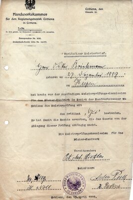 Meisterbrief im Schuhmacherhandwerk von Heinrich Dixius aus Eisenach (Eifel). Der Meisterbrief enhält ein Siegel, das Logo der HWK in Trier und zwei Unterschriften. Das Siegel fehlt.