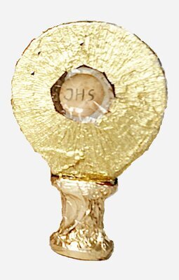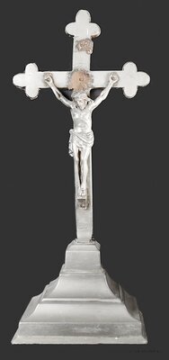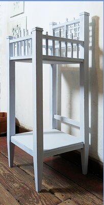 Ständer für sakrale Gegenstände, Blumenschmuck, o.ä. Der quadratische Ständer besittzt 4 eckige Füße, die unten etwas angespitzt sind. Er besitzt 2 Eb ebenen. die gleichzeitig als Versteifung dienen. Nur die obere Ebene besitzt eine durchlaufende Brüstung, die an der Rückseite etwa doppelt so hoch ist wie an den anderen Seiten. Der Ständer ist hellblau lackiert und in einem Sakralraum genutzt.