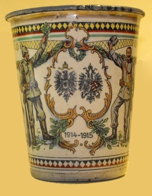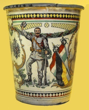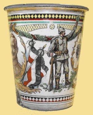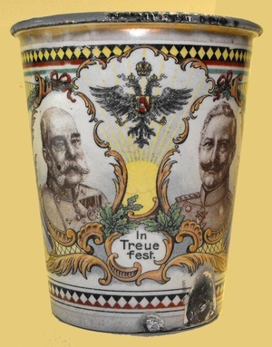 Konischer emaillierter Trinkbecher. Vorderseite: Die Kaiser Franz Josef I von Österreich (1848-1916) und Kaiser Wilhelm II von Deutschland (1888-1918) mit dem Spruch "In Treue fest." Seiten: Links und rechts jeweils ein Soldat in Kriegsausrüstung.