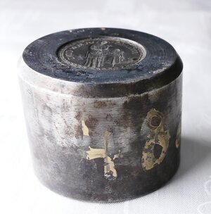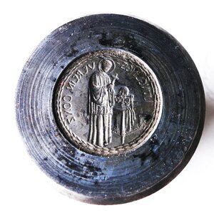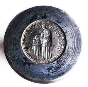Schlagstempel zur Herstellung von Medaillen des Jünglingsvereins Conz (heute: Konz). In der Mitte des Stempels ist das (seitenverkehrte) Negativ einer Münzseite. Zu sehen ist ein Priester mit Heiligenschein und mit einem Kreuz in beiden Händen (Hl. Franziskus?). Hinter/neben ihm steht ein Tisch mit edler Tischdecke und diversem (liturgischen) Gerät. Die Gegenseite ist nicht erhalten. Jünglings- und Jungfrauenvereine wurden Anfang des 19. bis Anfang des 20. Jahrhunderts in vielen Orten Deutschlands gegründet. Diese Vereine entstanden im Zusammenhang mit der evangelischen Erweckungsbewegung. Es gibt und gab jedoch auch katholische Jünglings- und Jungfrauenvereine (Wikipedia). Das Motiv des Stempels weist eindeutig auf einen katholischen Verein. Anmerkung: Das 2. Foto ist gespiegelt und zeigt die Graphik wie auf der geprägten Medaille.