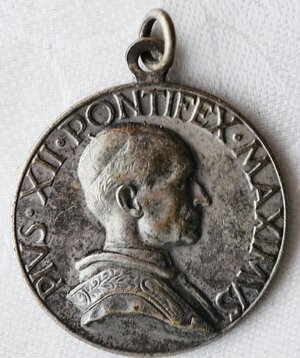 Runde Medaille als Andenken von einer Wallfahrt nach Rom zum Heiligen Jahr 1950. Für das Jahr 1950 rief Papst Pius XII ein Heliges Jahr (Jubeljahr) aus. Ein bemerkenswertes Ereigbis hierbei war die Verkündigung des Dogmas der Leiblichen Aufnahme Mariens in den Himmel. Des weiteren wurden zwei Ablässe gewährt. Pius XII gehört aufgrund seines (vermuteten) Verhältnisses zu Faschisten un Nationalsozialisten zu den eher umstrittenen Päpsten. Vgl. hierzu den sehr umfangreichen Wikipediaartikel (Link s.u.) Die Vorderseite der Medaille zeigt deN Kopf von Pius XII. in Profilansicht. Um ihn herum steht der Schriftzug PIUS XII PONTIFEX MAXIMINUS Die Rückseite zweigt die Kuppel des Petersdoms. Oben eigerahmt von zwei Engeln mit je einer Banderole: ANNO JUBILAE ROMA MCML Unter der Kuppel befindet sioch das päpstliche Wappen und neben und unter diesem der Schriftzug PAX HOMINIBUS BONAE VOLUNTATIS